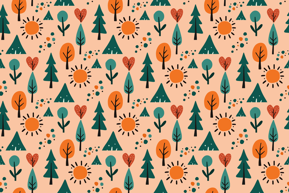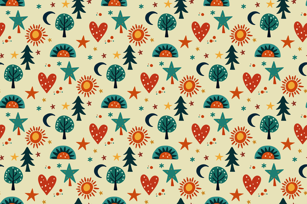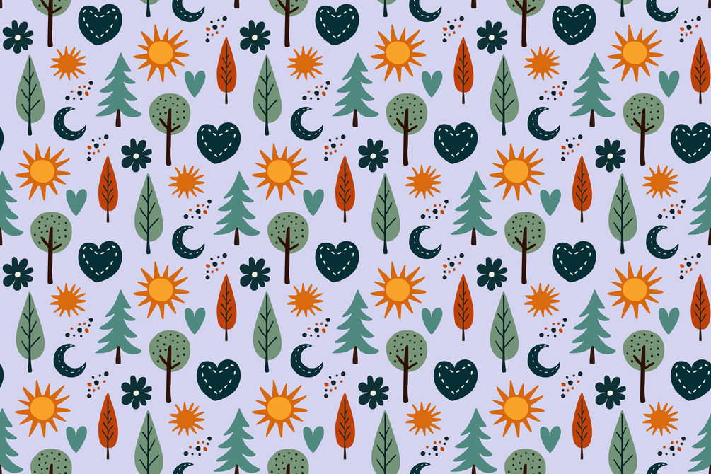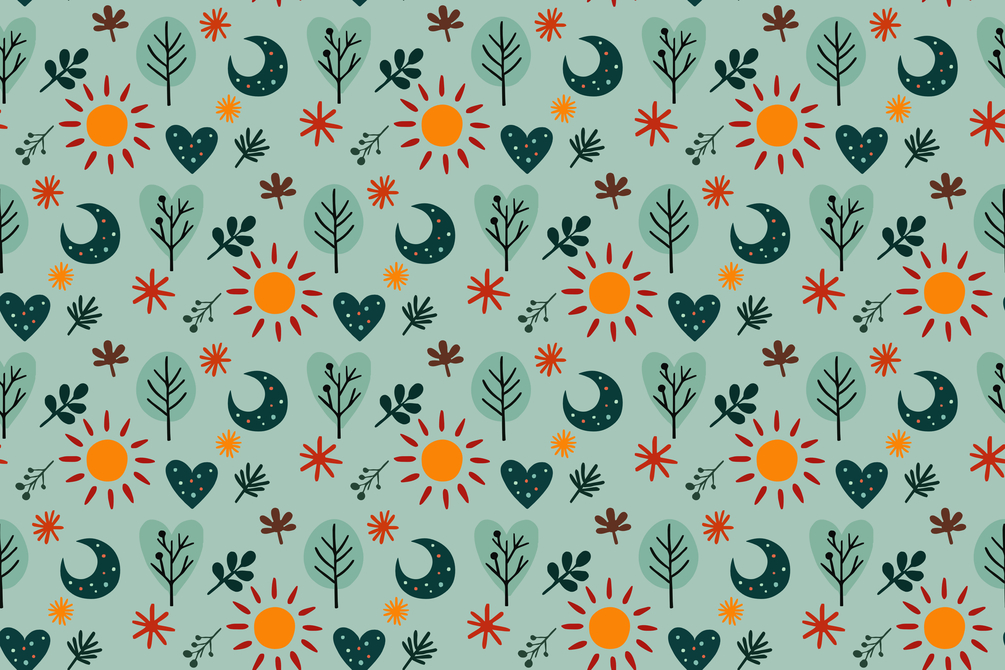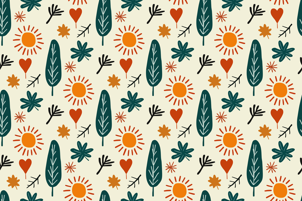 Vibrant floral seamless pattern. Stylized suns, leaves, and hearts in refreshing teal and green. Great for apparel, home decor, and wrapping paper. Cheerful, natural aesthetic
