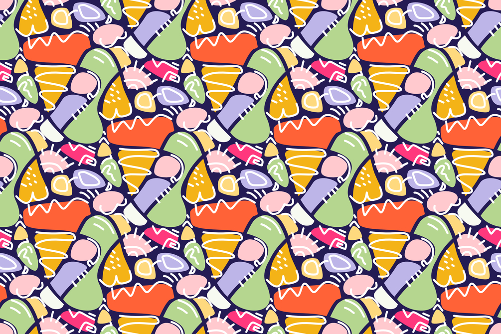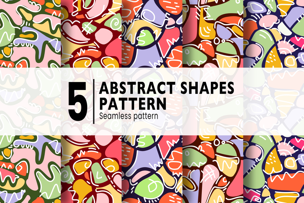 Bring a bold, creative spark to your designs with this collection of 5 seamless abstract shape patterns. These vibrant, hand-drawn compositions feature playful forms and striking color palettes, perfect for use in everything from digital artwork to product packaging.